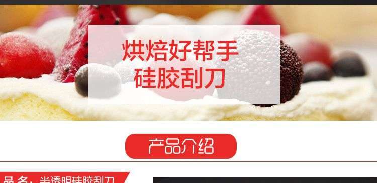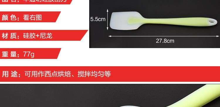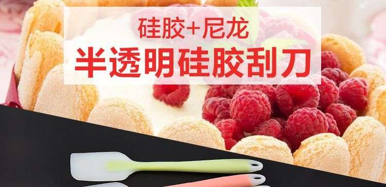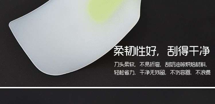 【用途】做蛋糕,攪拌蛋白和蛋糕面糊均勻而不消泡;可有效刮凈攪拌盆表面的殘留面糊、蛋白糊,集中食材并再次利用,減少損耗;抹平倒入模具中的面糊等等;清洗方便用于刮去不沾烤盤、不沾布、鋁合金烤盤等上面的殘渣、碎屑,不會刮傷產品表面。